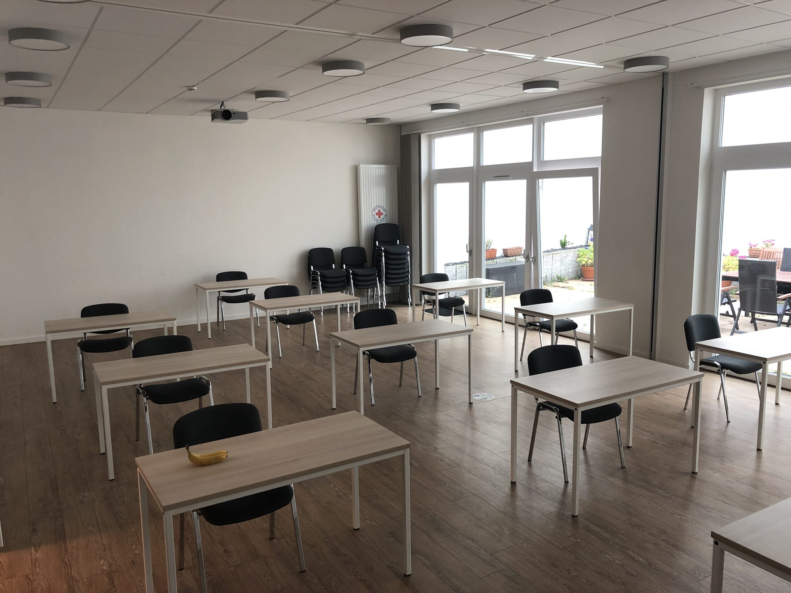 Die Räumlichkeiten sind neu und modern ausgestattet. Üblicherweise werden die Tische nicht wie hier im Bild gezeigt für "Frontalunterricht" aufgestellt, sondern in Plenumanordnung (U-Form) - damit wir besser in Kontakt kommen.